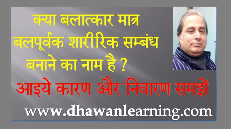 पहले बलात्कार के शाब्दिक अर्थ को समझा जाये :  बलात्कार का अर्थ बलात + कार अर्थात बलपूर्वक किया गया कोई भी कार्य, अब यह बल शारीरिक बल, आर्थिक बल, सामाजिक बल इत्यादि कुछ भी हो सकता है । और यह कार्य क्योंकि बलपूर्वक किया गया है, इसलिए दूसरे की इच्छा के विपतीत ही होगा । इस परिभाषा के अनुसार अपने नीचे काम करने वाले से कुछ काम उसकी इच्छा के विपरीत या अपने राजनैतिक दबाव से करवाना इत्यादि सब शामिल हैं । परंतु हम शायद बलपूर्वक शारीरिक और यौन संबंधो तक इसे सीमित कर देते हैं । अब यदि हम इसे शारीरिक सम्बन्धों तक ही यदि सीमित करें तो यह निश्चित है कि स्वस्थ मानसिकता का कोई पुरुष यदि बलपूर्वक स्त्री से शारीरिक संबंध किसी से यदि बनाता भी है तो उसे चरम सुख की प्राप्ति नहीं होगी। वह तो बलात अपनी कुंठा, क्रोध या मानसिक विकार के कारण ही ऐसा करेगा ।