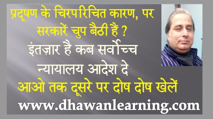 अब बात करते हैं सबसे महत्वपूर्ण और मेरे मित्र अनूप खन्ना जी के सुझाए मार्ग पर । हम मे से सब लोग इस प्रदूषण के प्रति जागरूक हों । शिक्षा के स्तर पर ही इसकी चर्चा भावी पीढ़ी के शिक्षा पाठ्यक्रम में हो और इस पर कुछ राष्ट्रीय आंदोलन चले । जिस प्रकार से स्वच्छ भारत अभियान है जिससे आम भारतीय इसके प्रति सजग हो । अब हर चालक अपने वाहन से निकालने वाले प्रदूषण पर सचेत हो । दुर्भाग्य यह है की सब कुछ कानून से करने की सरकारों की नीति । आज आपकी गाड़ी यदि प्रदूषण फैला रही है पर उसके पास प्रदूषण प्रमाण पत्र है तो उस पर कोई कार्यवाही नहीं है पर इसके विपरीत यदि वाहन प्रदूषण न करे पर आपके पास प्रमाण पत्र न हो तो आप दोषी करार दिये जाते हैं । स्वयं सोचे यह प्रमाण पत्र की मुहिम है या प्रदूषण नियंत्रण की ।