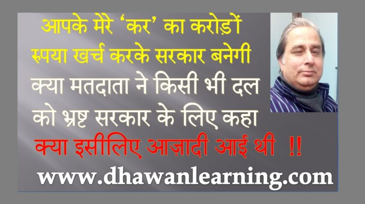 दूसरे शब्दों मे सालाना बजट के 25% सरकार बनाने मे खर्च हो जाएगा तो इस धन की वसूली आप से और मेरे से ही कर के मध्ययम से होगा । इसके अतिरिक्त आप यह भी समझें कि इस हमाम मे सब नंगे हैं । कोई सांपनाथ और कोई नागनाथ । कोई भी राजनैतिक दल इसका अपवाद नहीं है। दुर्भाग्य यह है कि जनता इन सब पर अन्ध श्रद्धा रखे हैं । जो शिव सेना के समर्थक है उनके लिए शिव सेना का ठीक कदम है, जिनके लिए भाजपा ठीक वह उनके कदम को ठीक बताएँगे और जो लोग राष्ट्रीय काँग्रेस के कट्टर समर्थक है उनके लिए वही ठीक है । कुछ लोग सर्वोच्च न्यायालय या उन दलों को शुचिता का उपदेश देंगे । शायद सर्वोच्च न्यायालय कोई नया कानून भी बना सकती है । परन्तु इस पूरे खेल में आम जनता को भी कदम उठाना चाहिए । अब जिन लोगों के व्यक्तिगत स्वार्थ इन राजनैतिक दलों से है, जो उन विधायकों के द्वारा दिये गए कामों की प्रतीक्षा कर रहे हैं, उन्हे आप अपवाद समझ कर या स्वार्थी समझ कर छोड दे।