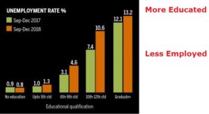 90 के दशक में लगभग 20000 इंजीन्यरिंग की सीटें थी और देश को लगभग इतनी ही इस क्षेत्र के स्नातकों की आवश्यकता थी । तो जो पढ़ा उसे अच्छी नौकरी मिल जाती थी । लेकिन इसी क्षेत्र में आज देश में लगभग 40000 इंजीनियर की आवश्यकता है । परंतु 16 लाख से अधिक इंजीनियर आज प्रति वर्ष बनाए जा रहे हैं । इसी के साथ दूसरे प्रॉफेश्नल कोर्स आप देखें तो 35 लाख विद्यार्थी उत्तीर्ण हो रहे हैं ।  यदि कुल स्नातक देखें तो 50 लाख के पार हैं । अब जब 50 लाख विद्यार्थी शिक्षित आएंगे और बाज़ार में कुल लगभग 5 लाख नौकरियाँ हैं तो प्रतिवर्ष आप 35 लाख से अधिक बेरोजगार पैदा करते रहे । लगभग 20 वर्षों में सेवा क्षेत्र ने नए आयाम जोड़े । इसी कारण नए रोजगार के अवसर आए । परंतु कुछ समय यानि लगभग 2017 के बाद स्थिति भयावह होने लगी । निजी संस्थान मात्र फीस ले कर युवाओं को पढ़ाते रहे ।बार बार अनेक औद्योगिक सलाहकार, शिक्षाविद और समाज शास्त्री इस नयी शिक्षा प्रणाली, जिसके तहत निजी संथाओं को नए विश्वविद्यालय बनाने तक का अधिकार दे दिया गया, के विषय में कहते रहे । परंतु सरकारों ने आंखें मूंद रखी थी ।  ऐसा नहीं है की नए रोजगार के अवसर नहीं आए, परंतु रोजगार से अधिक पढे लिखे युवा सामने आते गए । Kotak के एक सर्वे के अनुसार पढे लिखे बेरोजगारों की वृद्धि अधिक हुई है ।
