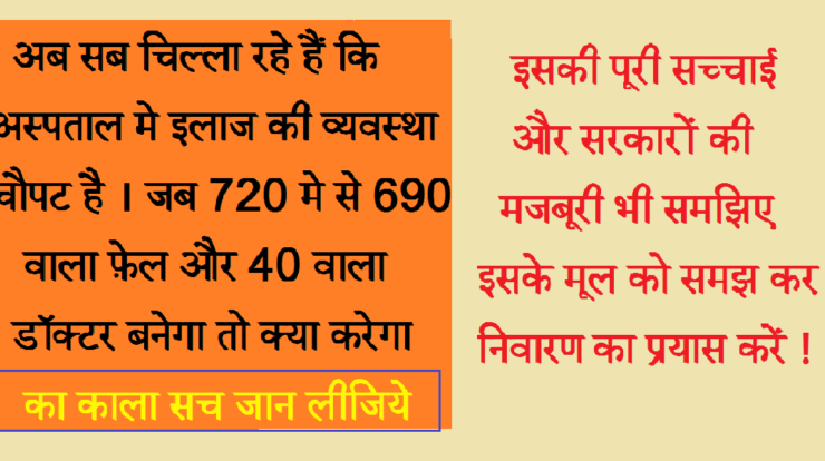 बिहार में बच्चों की मौत के बाद social media पर यह संदेश घूम रहा है कि जब 720 मे से 690 पाने वाला फ़ेल तो 40 अंक पाने वाला डॉक्टर बनेगा तो क्या करेगा , यह संदेश नितांत भ्रामक और मात्र आकर्षण पाने के लिए किया गया है । आइये ज़रा इसके सच को आज की तारीख में समझें । अभी NEET नामक परीक्षा चिकित्सा क्षेत्र में विध्यालय विशेषतया MBBS मे प्रवेश पाने के लिए दी जाती है । इसमे अब जिस प्रकार के संदेश आप देख रहे हैं, पहली बात तो यह पूर्ण सत्य नहीं है और जो भी विषमताएं इस परीक्षा में है उसका मूल कारण आरक्षण से अधिक सरकारी नीतियाँ है जो धनवान विध्यार्थी को पढ़ने का सुअवसर दे सकती हैं यदि आप के पास 70 लाख रुपये है परंतु एक प्रतिभाशाली को प्रवेश नहीं दे सकती । घूम फिर कर बात फिर उसी भूमंडलीकरण की नीतियों पर आ जाती है, जिसके बाद यह शिक्षा का क्षेत्र व्यावसायिक घोषित हो गया ।