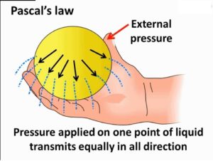 Then comes Pascal Law in which it is stated that for a confined liquid, pressure is equally transmitted in all directions, be careful it is not distributed but transmitted . Based on this law we use two devices Hydraulic lift and Hydraulic brake .